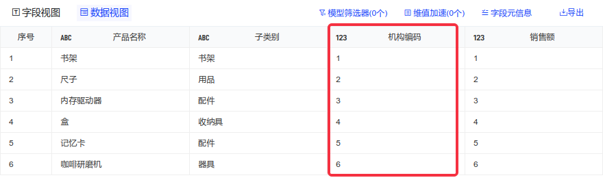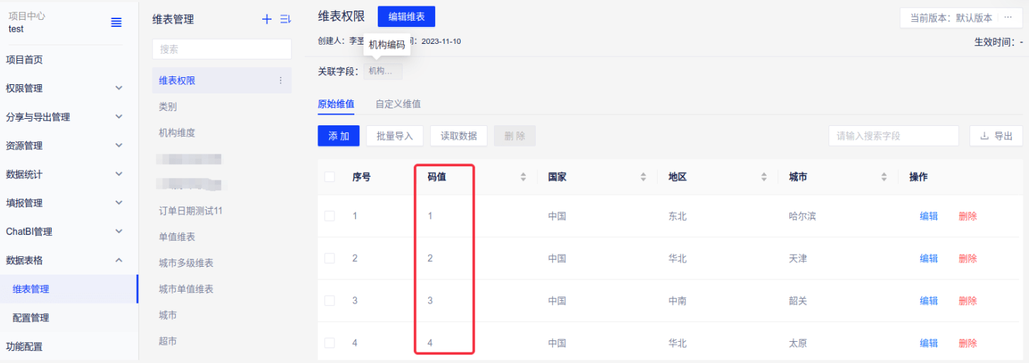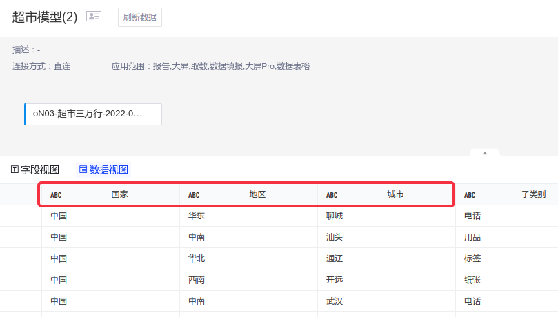 (1)将业务表中的码值(机构编码)字段与维表关联,然后从主数据表中读取(或手动输入)层级关系,码值在哪一级就读取到那一级;下图的码值实际为城市id,则维表只需创建/读取到城市级;