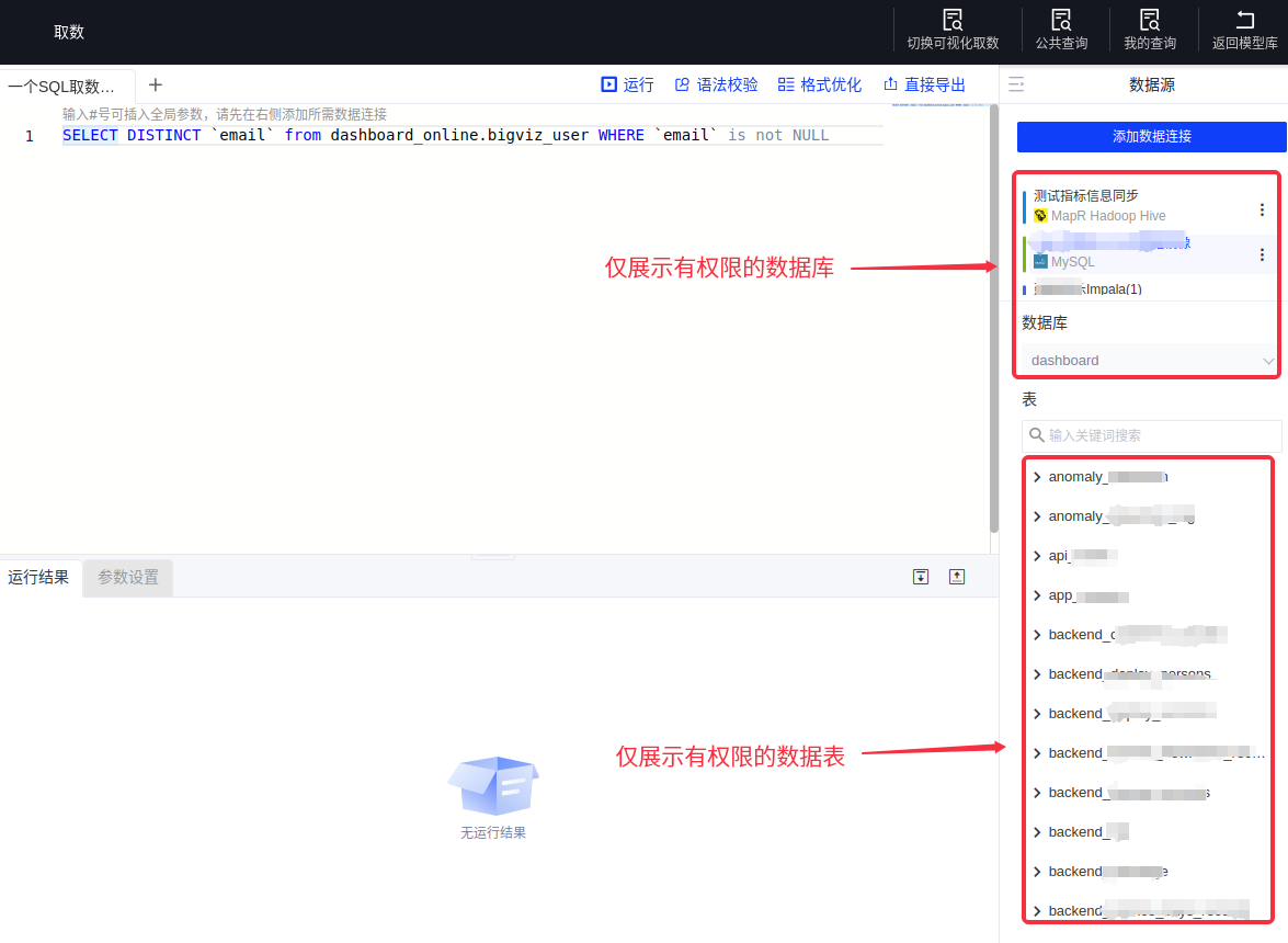 自定义sql取数只能展示和使用有权限的数据库数据表