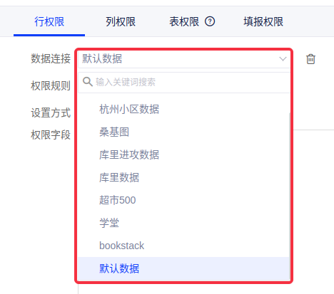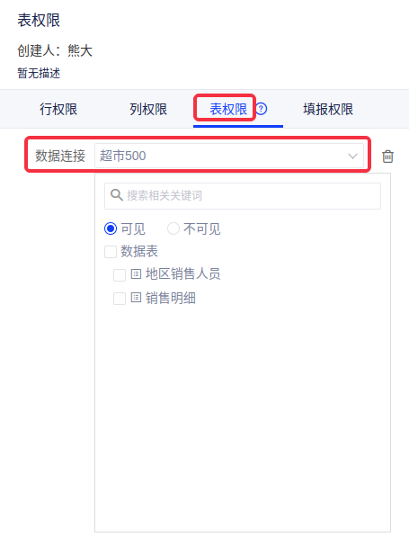 (1)在表权限设置界面,选择需要设置访问权限的数据连接,不支持内置连接;