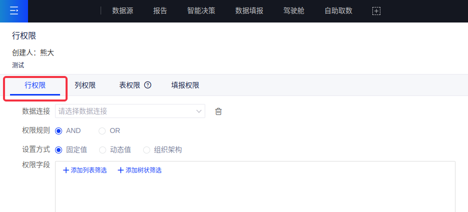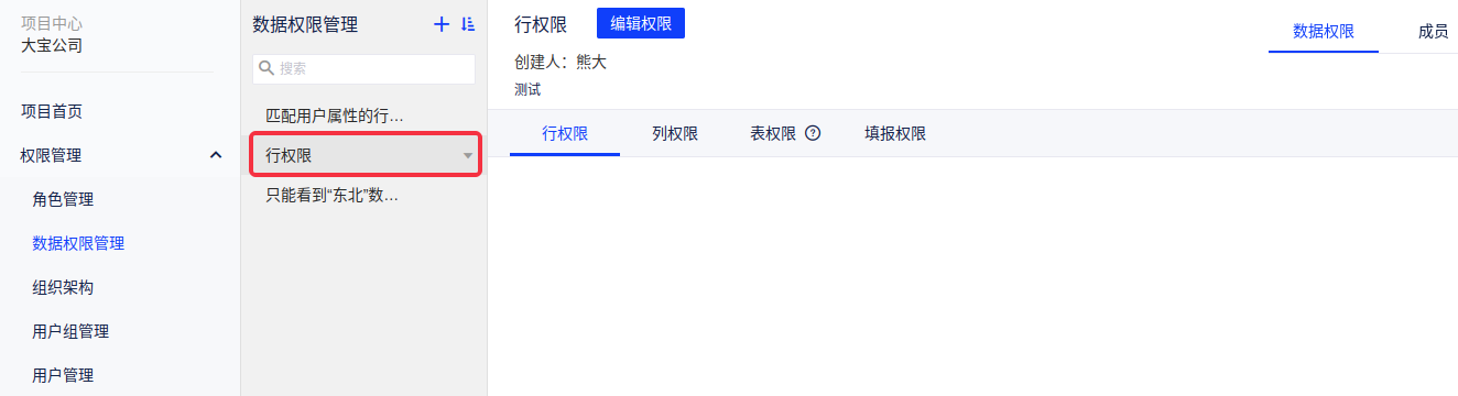在数据权限的编辑页面,选择行权限,进入配置页面;
