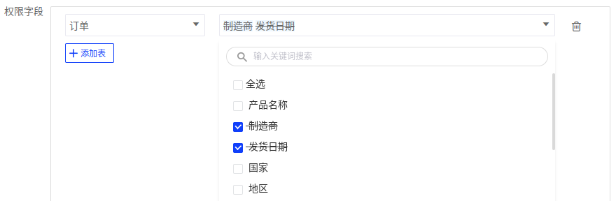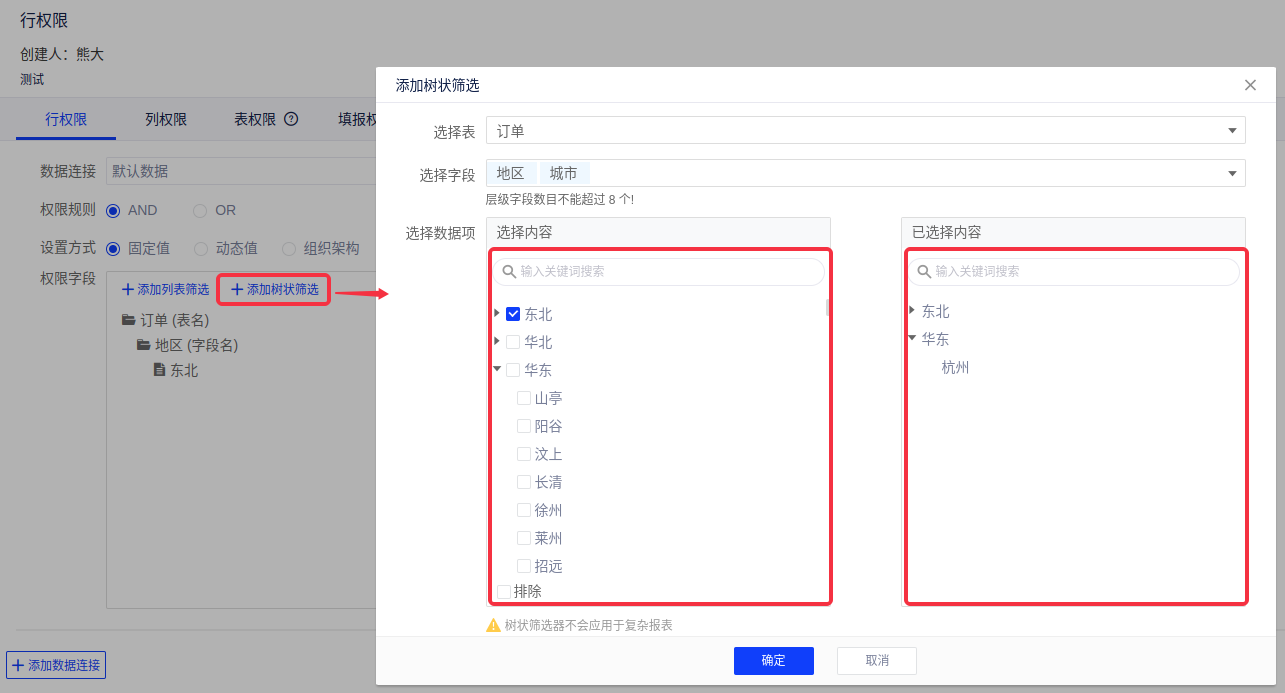例如:在权限字段中,首先选择订单表—地区—东北,其次选择订单表—类别—B