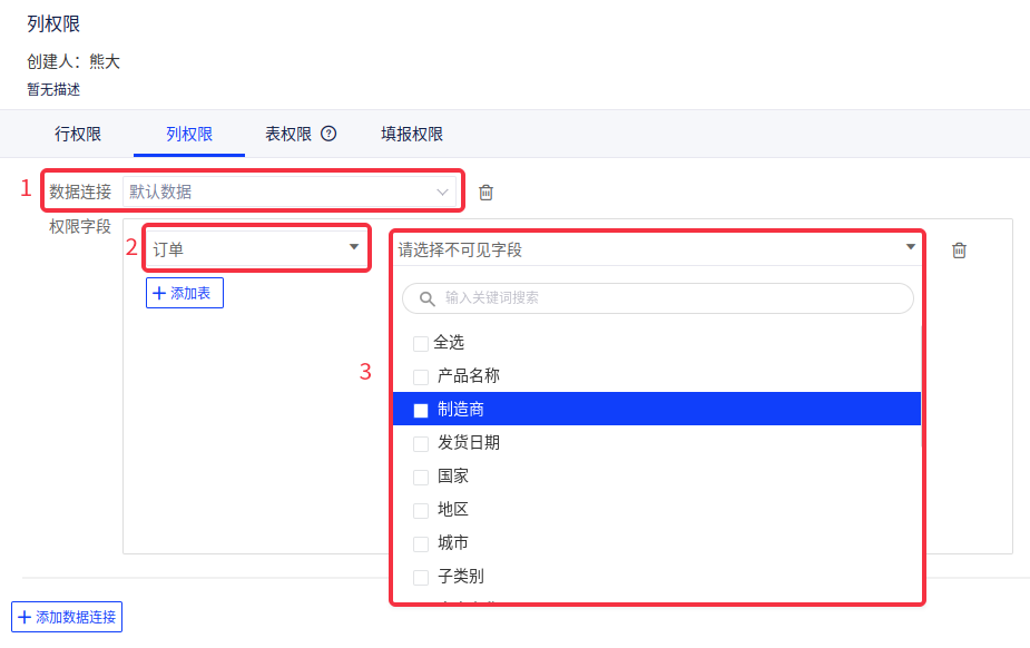 (1)在列权限设置界面,选择需要设置访问权限的数据连接和权限字段所在表;