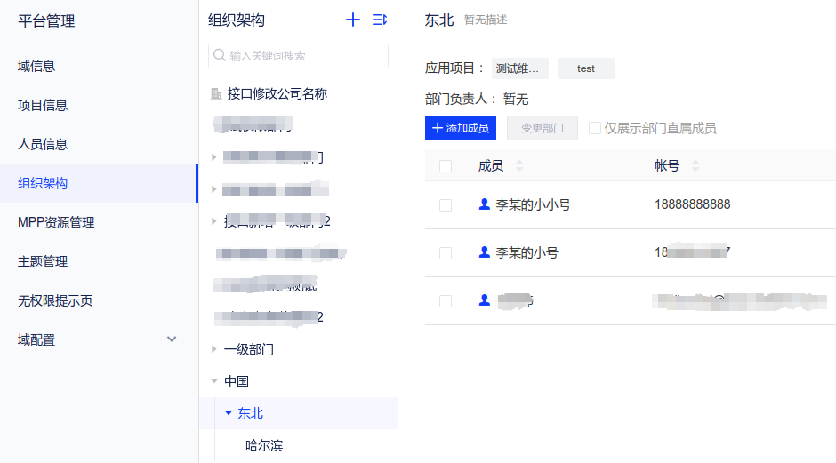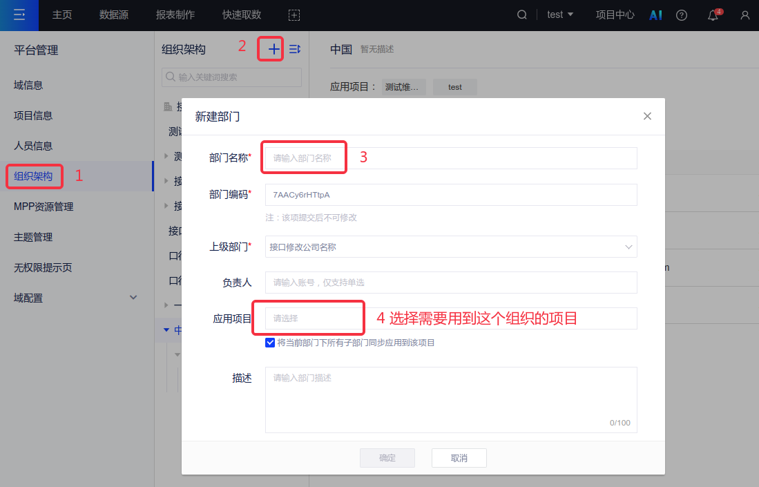 (1)需要事先设置好组织架构树,设置路径:平台管理(或企业域管理)-组织架构-新建部门。
