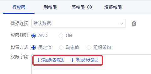设置方式选择【固定值】时,可通过【添加列表筛选】或【添加树状筛选】设置不让用户查看的字段。
