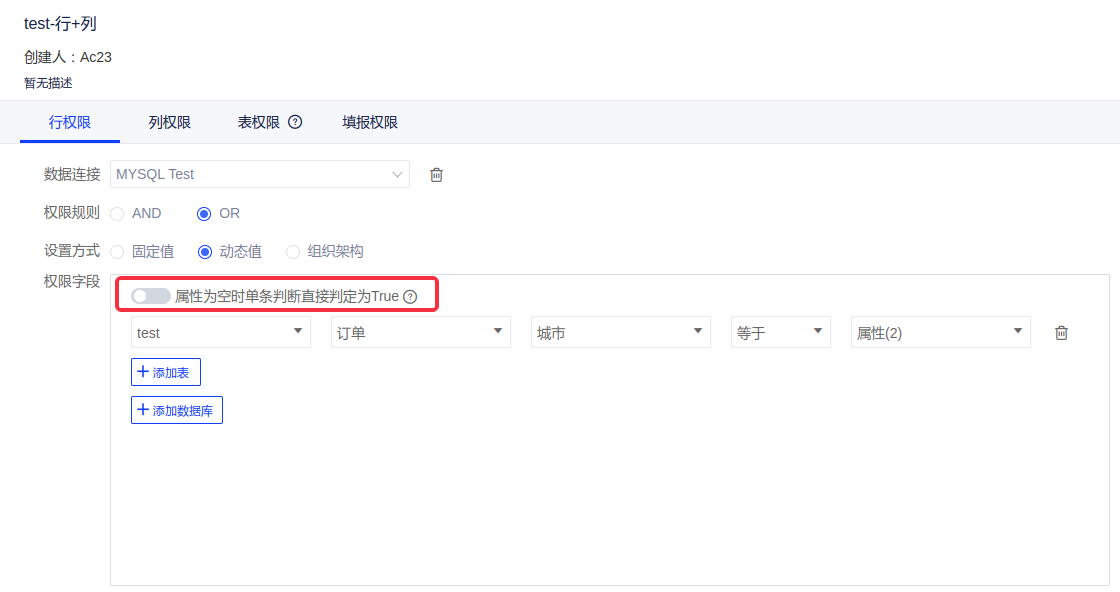 - 如A用户的用户属性【部门】为空,设定单条判断“【订单】表【地区】字段等于【部门】”,若开关关闭,则忽略该单条判断,否则则判定为True