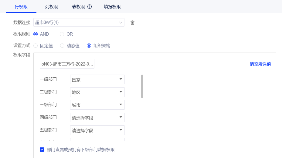 将行权限设置方式设置为“组织架构”,将组织层级与数据字段匹配;“部门直属成员拥有下级部门数据权限”勾选后,即可实现大区级的员工能够看到下辖城市的数据