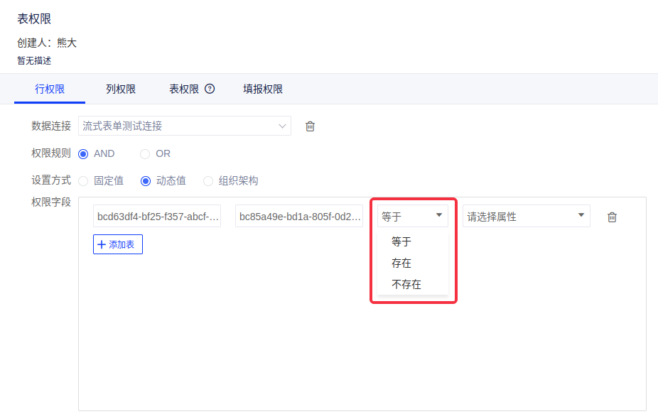 (4)行权限配置中的动态属性配置支持运算符:等于、不等于、存在、不存在