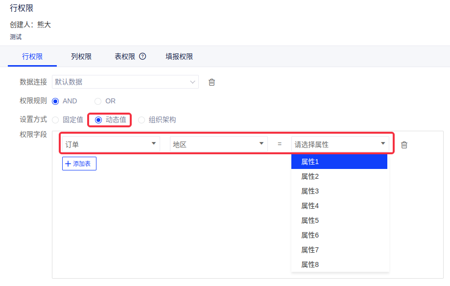 (1)将设置方式设置为“动态值”,然后选择要设置权限的表、字段和要匹配的用户属性。