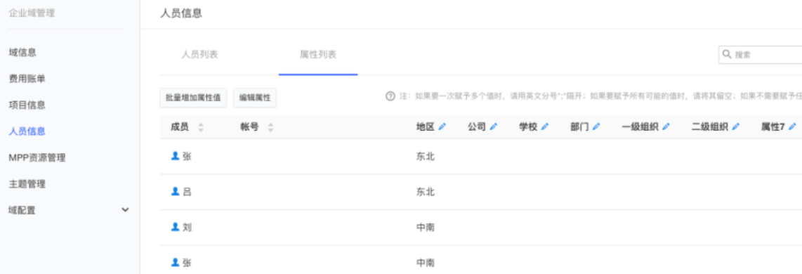 根据用户属性来进行数据行级权限管控。用户属性设置路径:企业域管理-人员信息-属性列表-设置一个属性值地区,在对应用户后输入东北或其他地区。