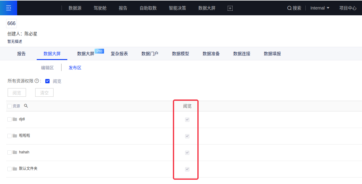 (2)如果只在权限管理的发布区对角色选择了阅览权限,则角色的操作权限只有阅览文件夹下大屏,大屏发布页面没有“去编辑”按钮;