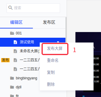 (1)在编辑区右键选择好的大屏,点击“发布大屏”;