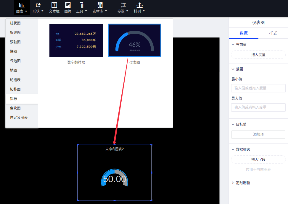 (1)选择“图表”控件,找到“仪表图”并添加到画布中;