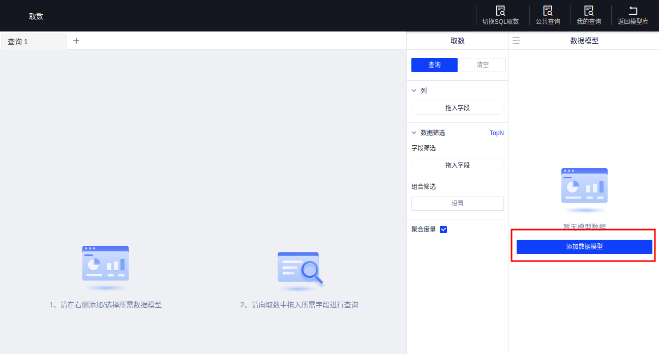 (1)添加模型。您在进行首次查询时,需要添加所需数据模型,点击【添加数据模型】,进入模型列表;