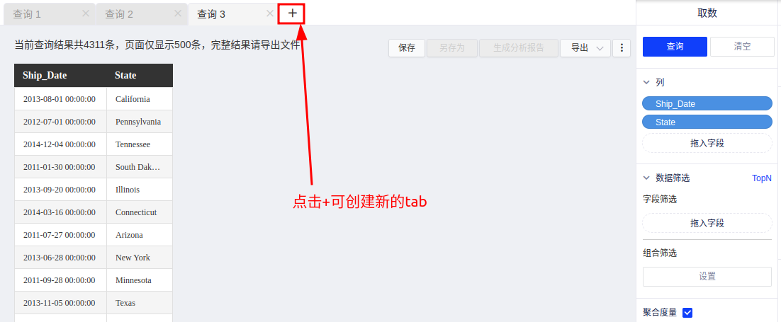 一个tab页仅支持一次查询,打开新的查询时,默认打开一个新的tab页进行查询,也可点击添加按钮添加多个tab页查询窗口(目前支持最多同时打开10个tab页,最少1个),同时进行多个不同查询,提高取数效率。
