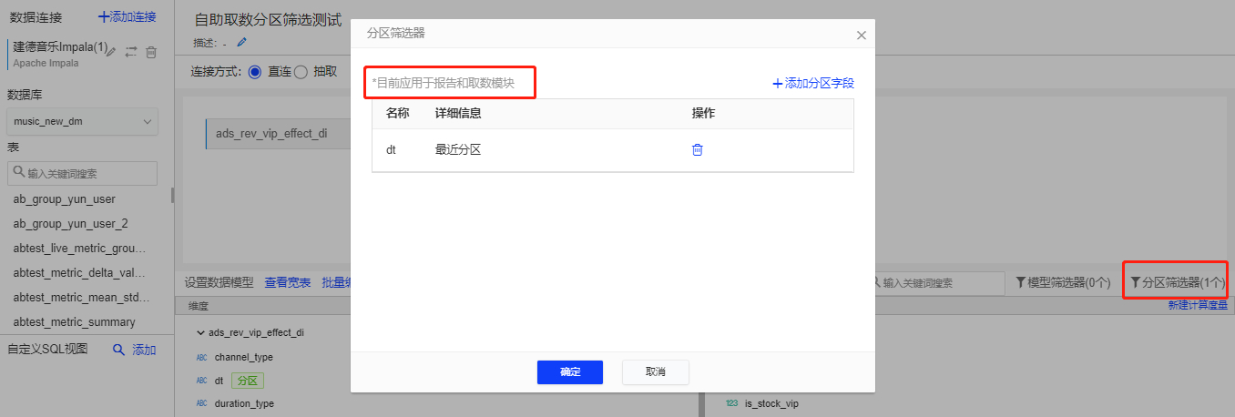 - 模型层隐藏分区字段,默认最新分区且报告中不含筛选器;