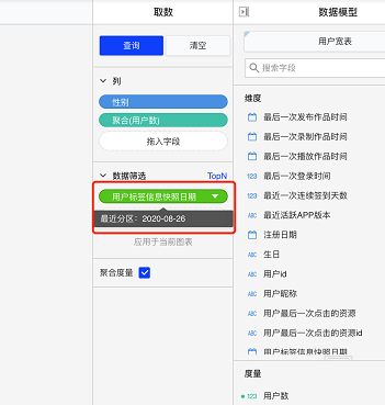 当将含有分区的字段拖入或双击时,筛选器会默认选中最近分区,不再需要扫描整个数据库。