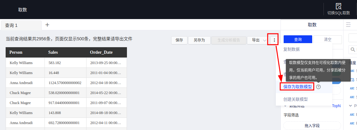 查询结果支持保存为新的取数模型,并支持编辑、分享。