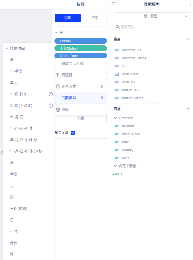 日期类型的字段:可快速切换字段类型,选择年、季度、月、日、小时等不同时间粒度,快速查看不同时间粒度的数据。