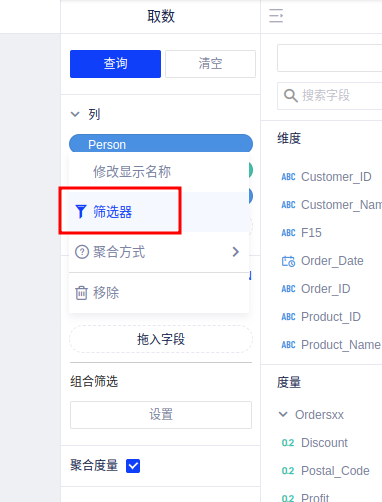 可手动拖拽字段到筛选面板,也可将数据面板的字段pill点击下拉选择【筛选器】,自动对该字段进行筛选: