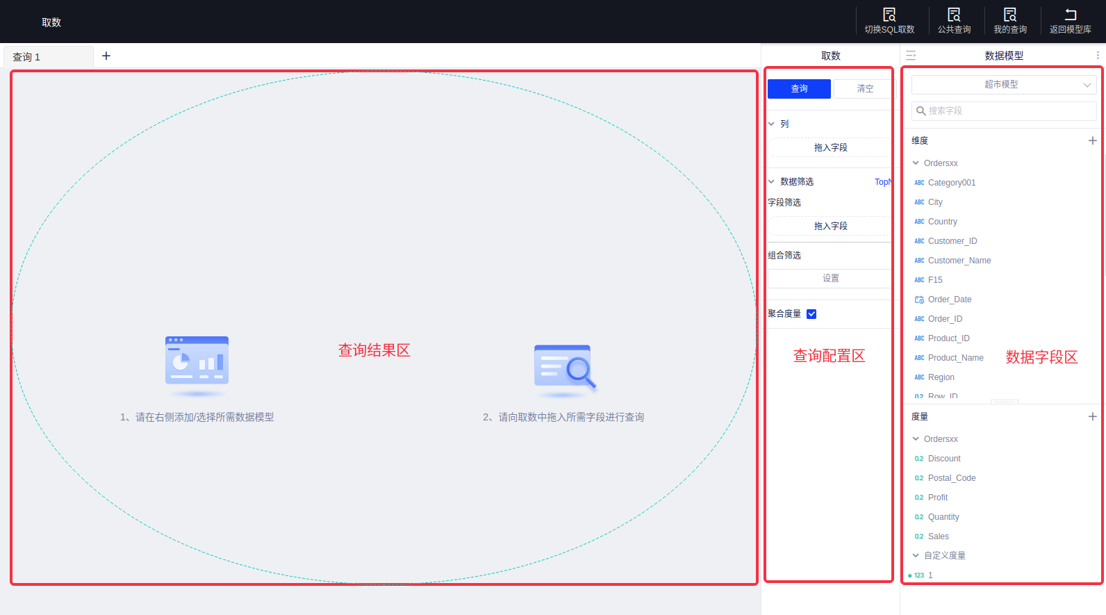 本章节介绍如何使用可视化自助取数。可视化取数的核心功能区域分为: