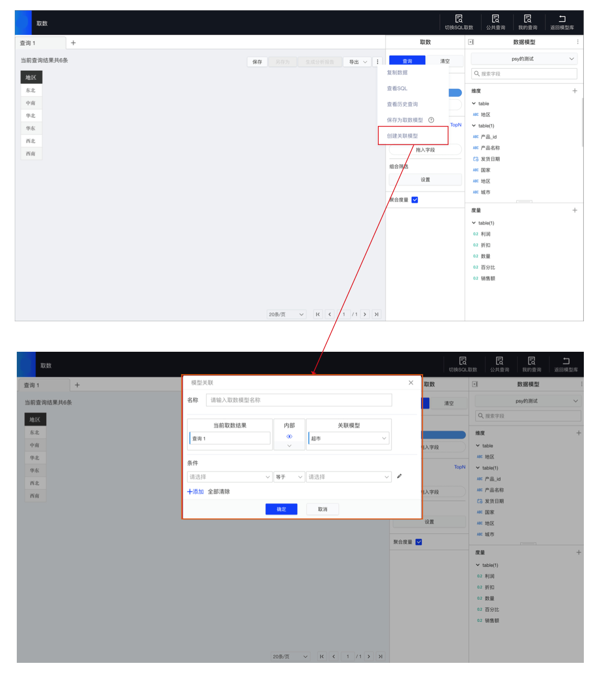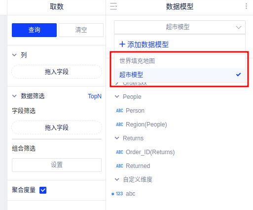 支持使用其他模型的字段对当前模型的取数查询进行筛选,拖入字段进行筛选,在数据筛选界面,可以选择用于筛选的模型,支持使用其他模型的字段。