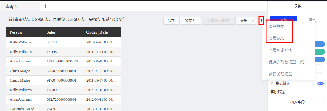 查询结果支持复制数据,也可查看SQL,复制的数据可作为筛选条件快速用于下一次的筛选。