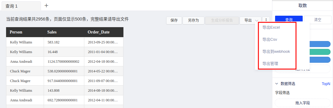 目前前端仅展示查询结果的前500条数据,如需查看更多数据,则需要导出查询结果,目前查询结果支持导出为Excel/Csv格式的数据文件,同时可将取数结果导出到webhook,从而对接其他系统,如标签系统、活动系统等。