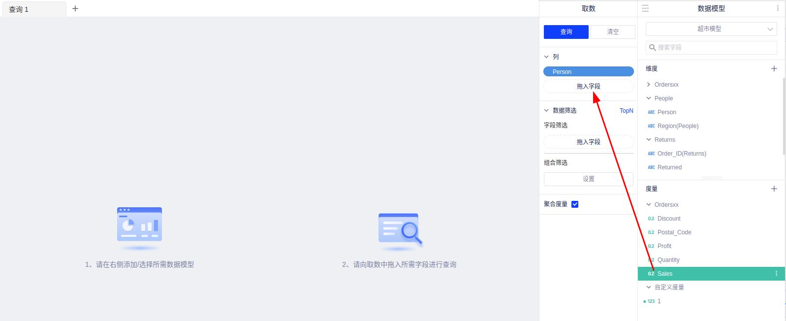 双击右侧数据列表的字段即自动添加该字段到查询面板,也可以手动拖拽所需字段到查询面板;