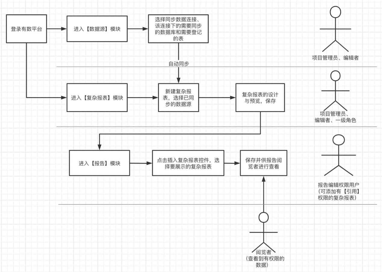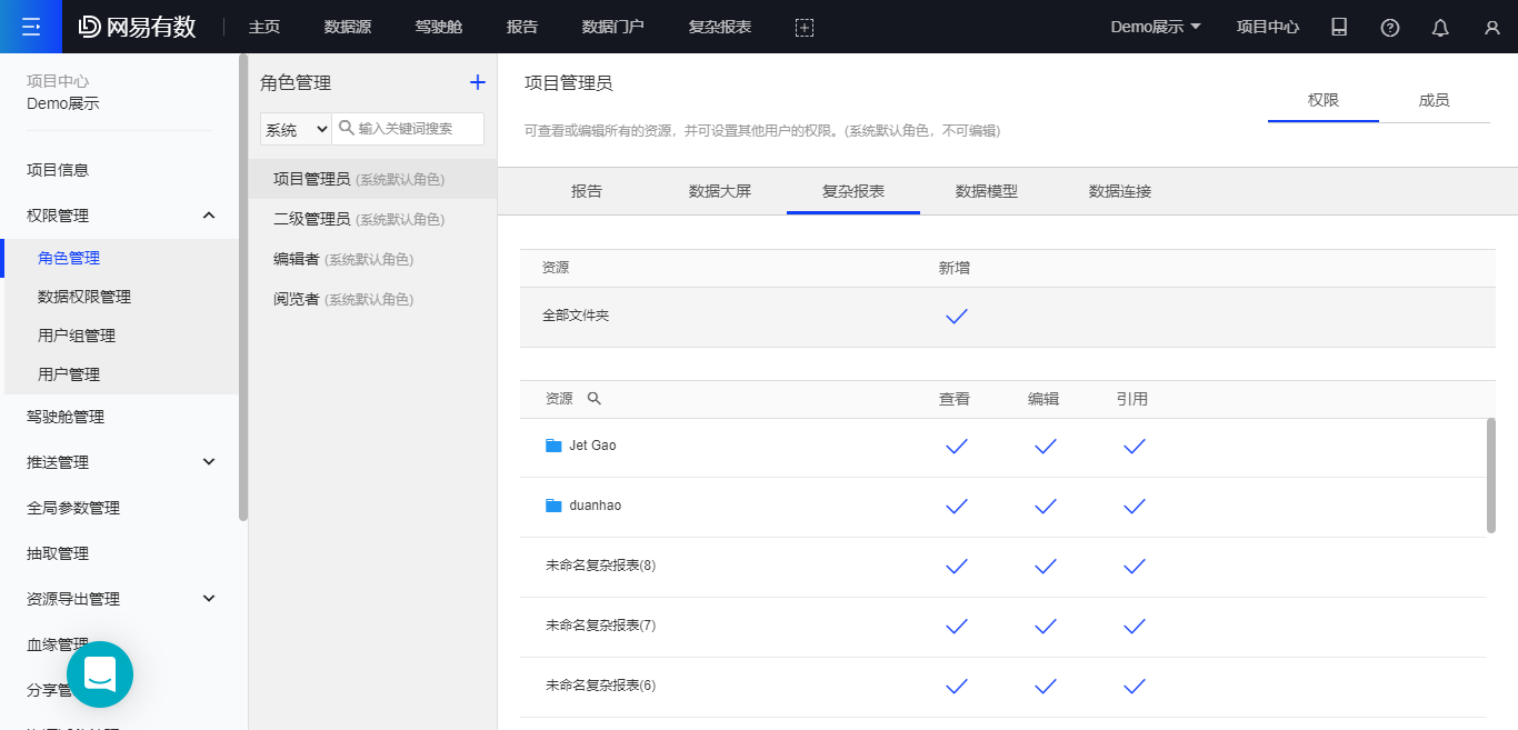 有数的系统角色中,项目管理员和编辑者默认有复杂报表的新增权限及项目中所有复杂报表资源的编辑、引用权限;阅览者默认没有复杂报表的【新增】权限,也没有项目中任一复杂报表资源的编辑、引用权限,即仅可以查看复杂报表。