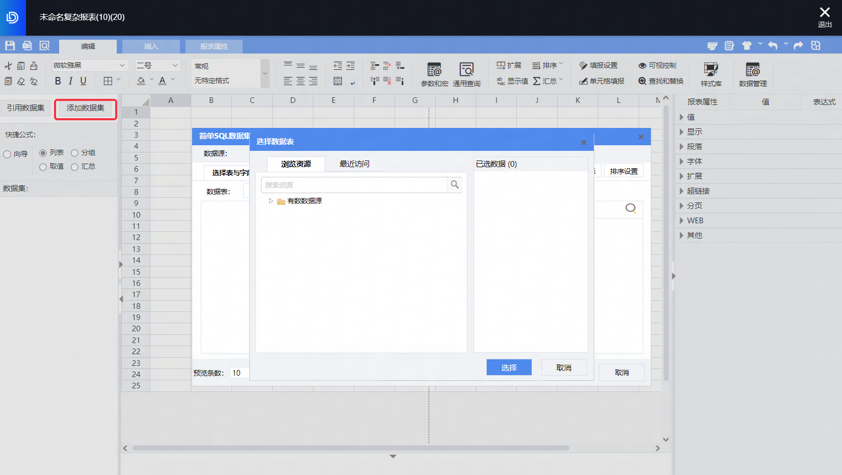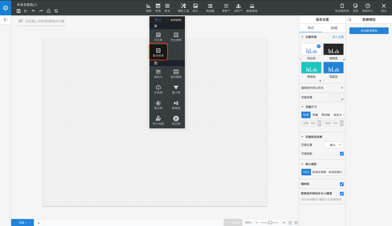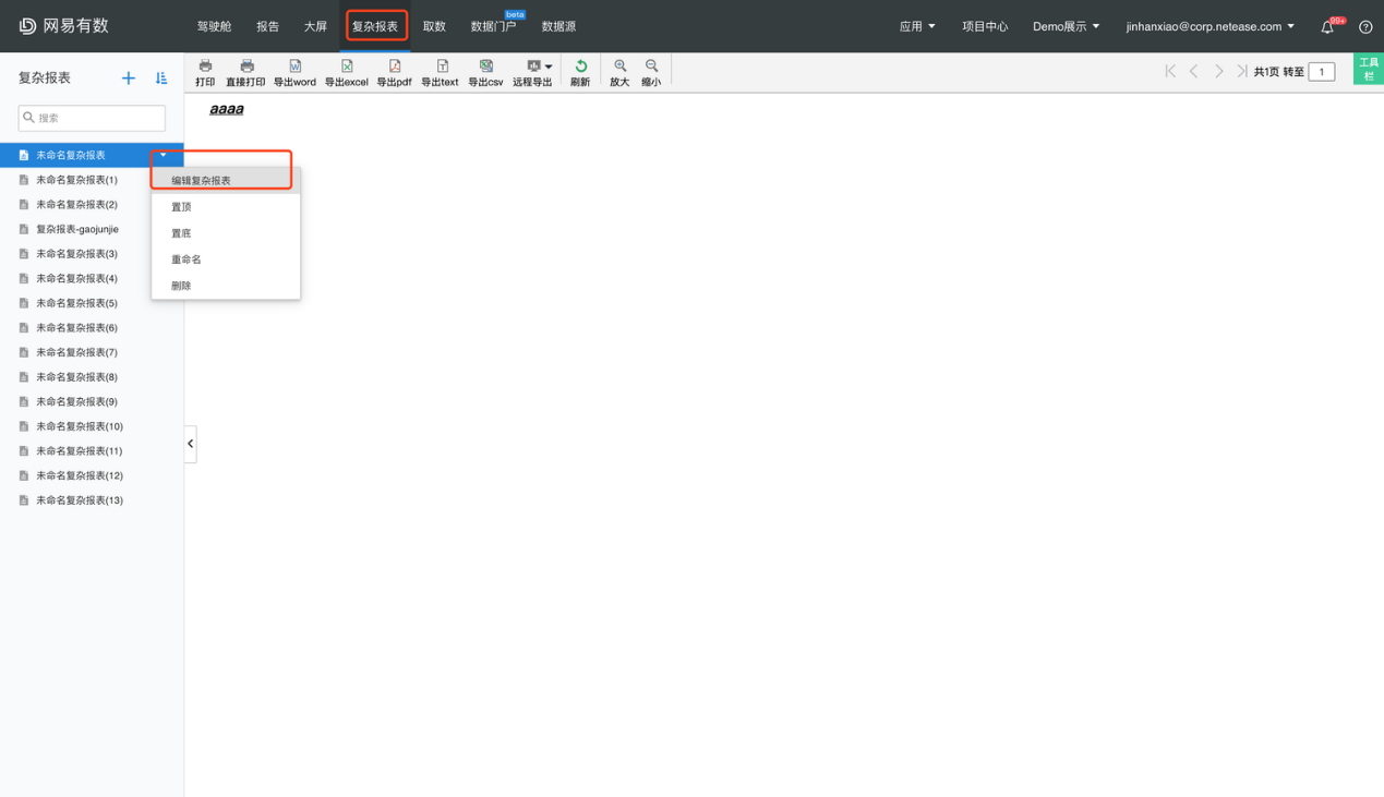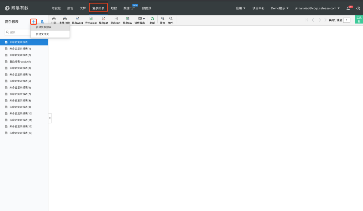 进入【复杂报表】模块,点击新增按钮,选择【新建复杂报表】或者对已有的复杂报表下拉选择【编辑复杂报表】,即可打开复杂报表设计器。