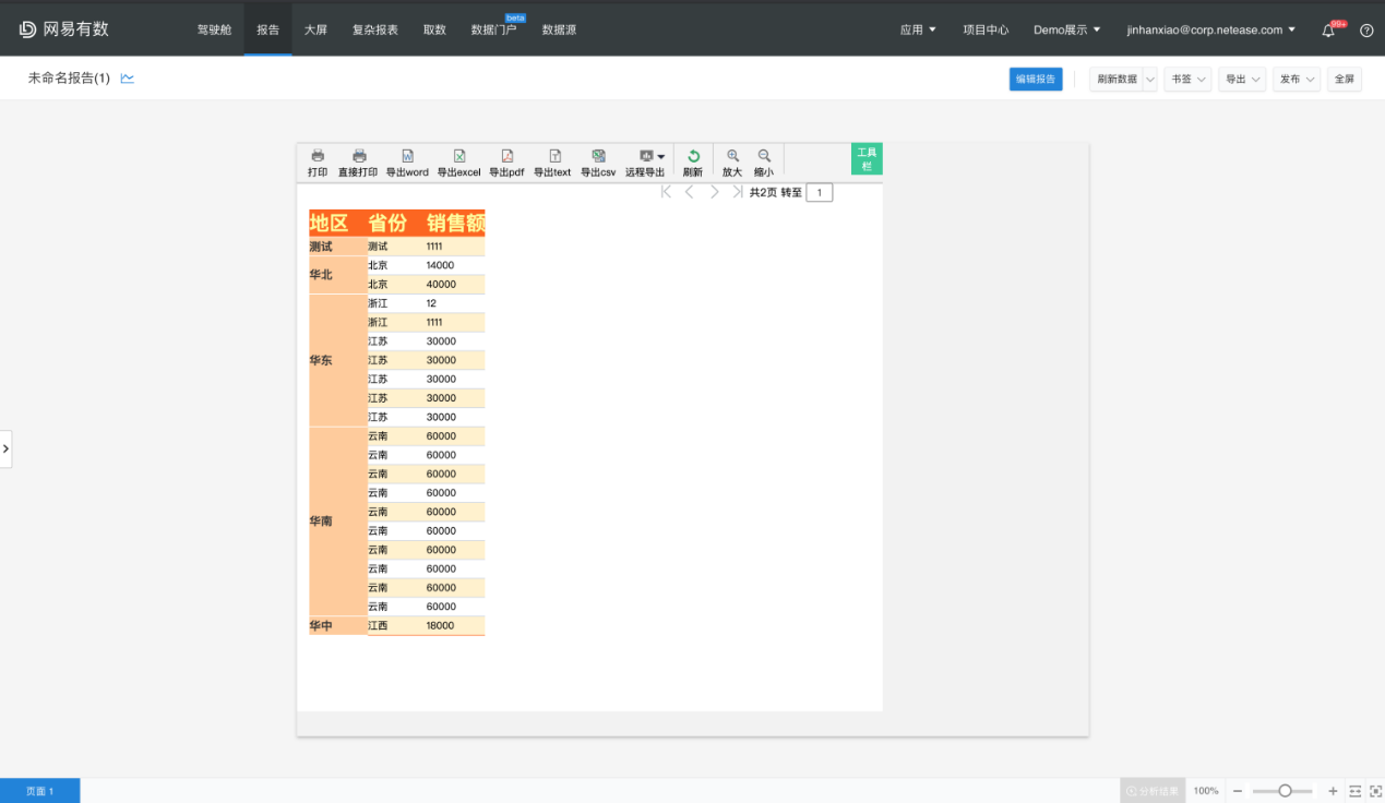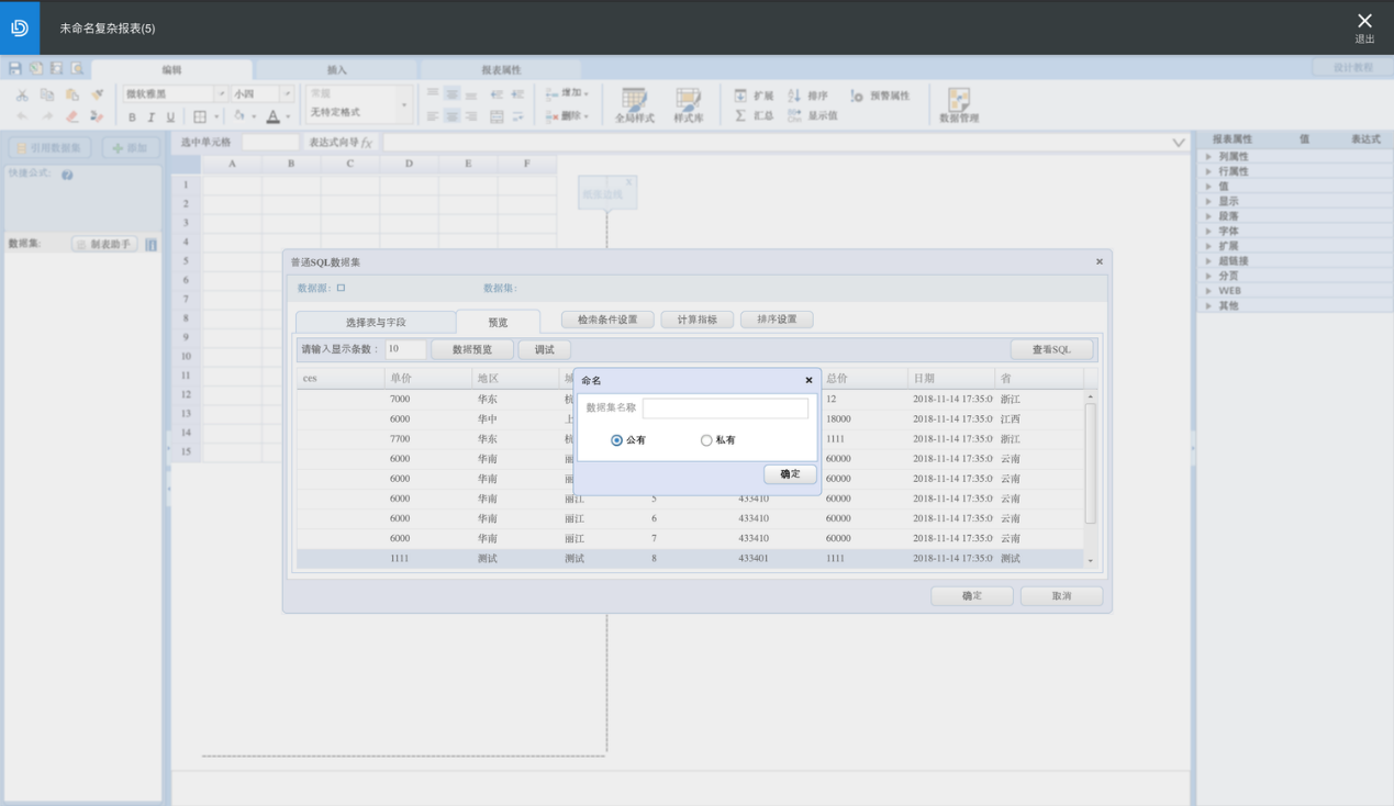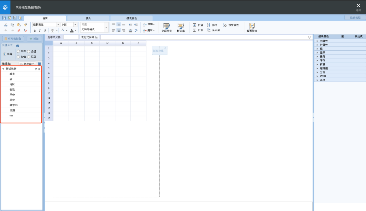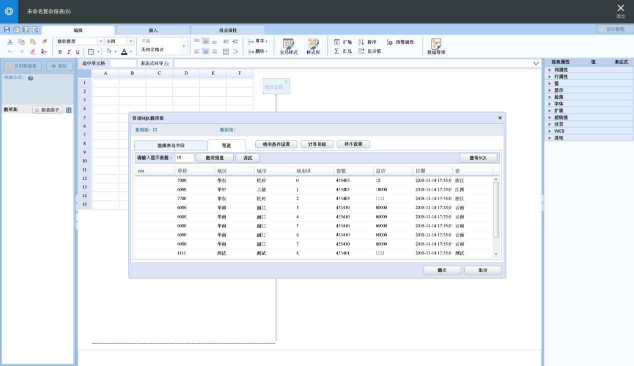 完成数据集的创建后,即可使用该数据集进行复杂报表的设计,详细功能及用户操作指导可点击右上角【设计教程】查看: