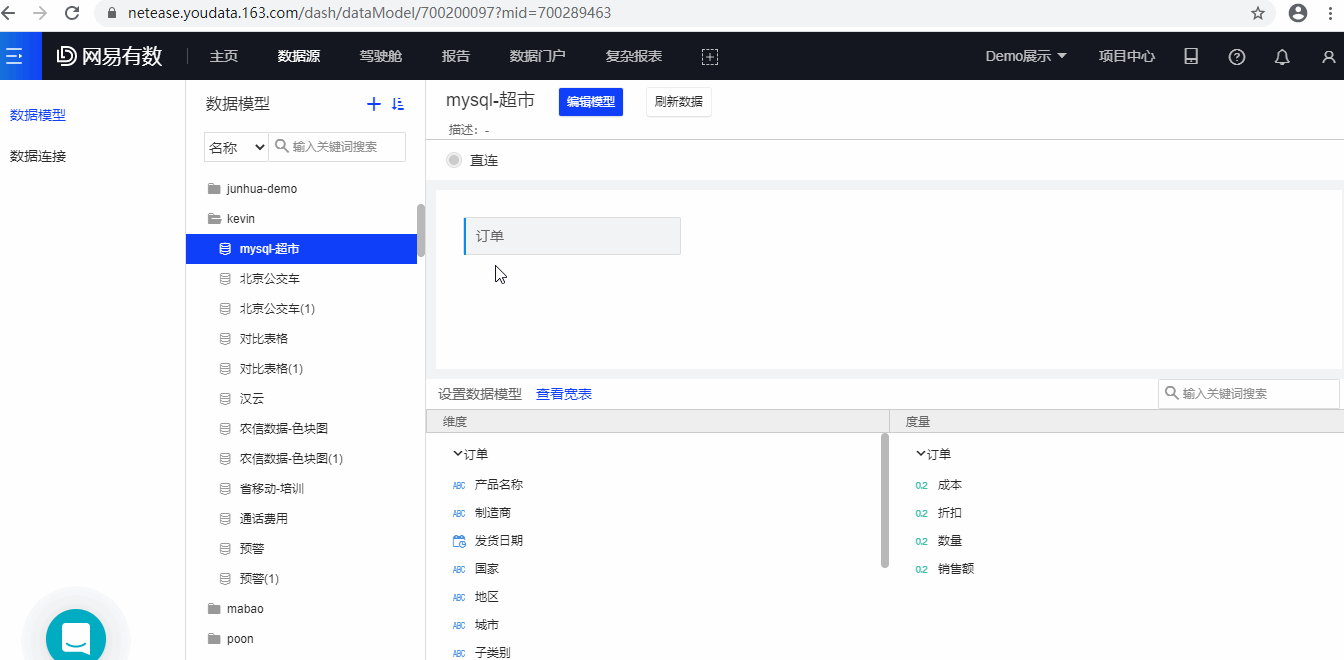 有数现已支持数据模型的同步,与数据连接一致,目前支持:MYSQL,ORACLE, HIVE, IMPALA, DB2, SQLSERVER, MONETDB, ClICKHOUSE, GREENPLUM, TERADATA几类数据源的同步。