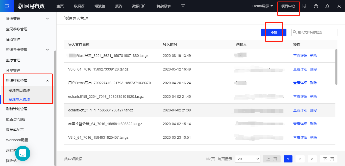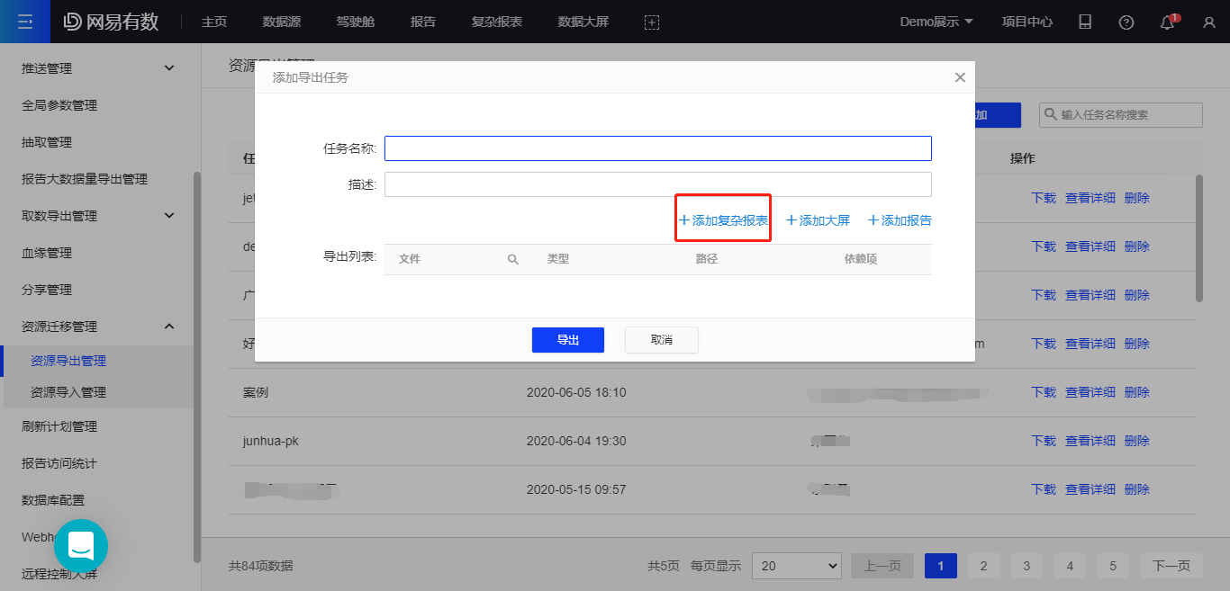 有数支持复杂报表的跨项目导入导出,点击项目中心-资源迁移管理-资源导出管理/资源导入管理-添加,即可对复杂报告进行导入导出操作。