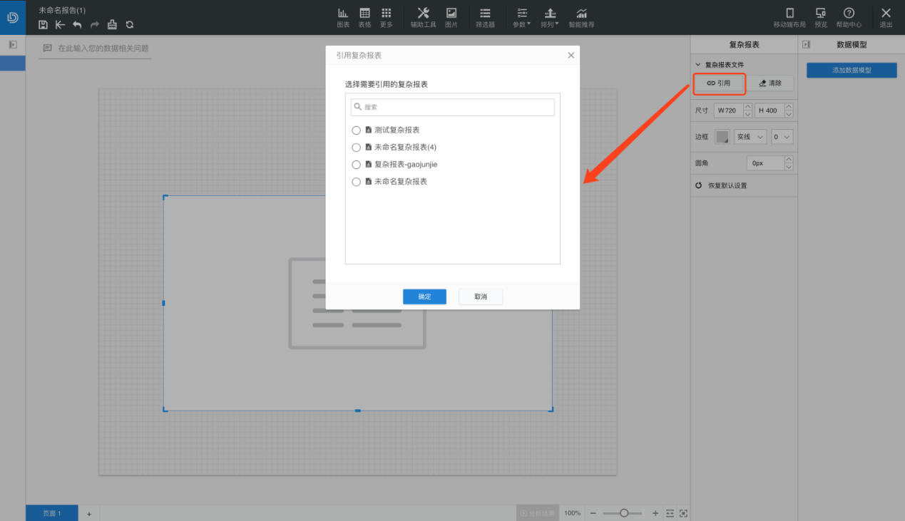 已经制作好的复杂报表可作为新图表插入到报告中,进入报告编辑页面,选择【更多-复杂报表】,插入复杂报表控件后,选择可引用的复杂报表,即可将制作完成的复杂报表与报告融合展示。