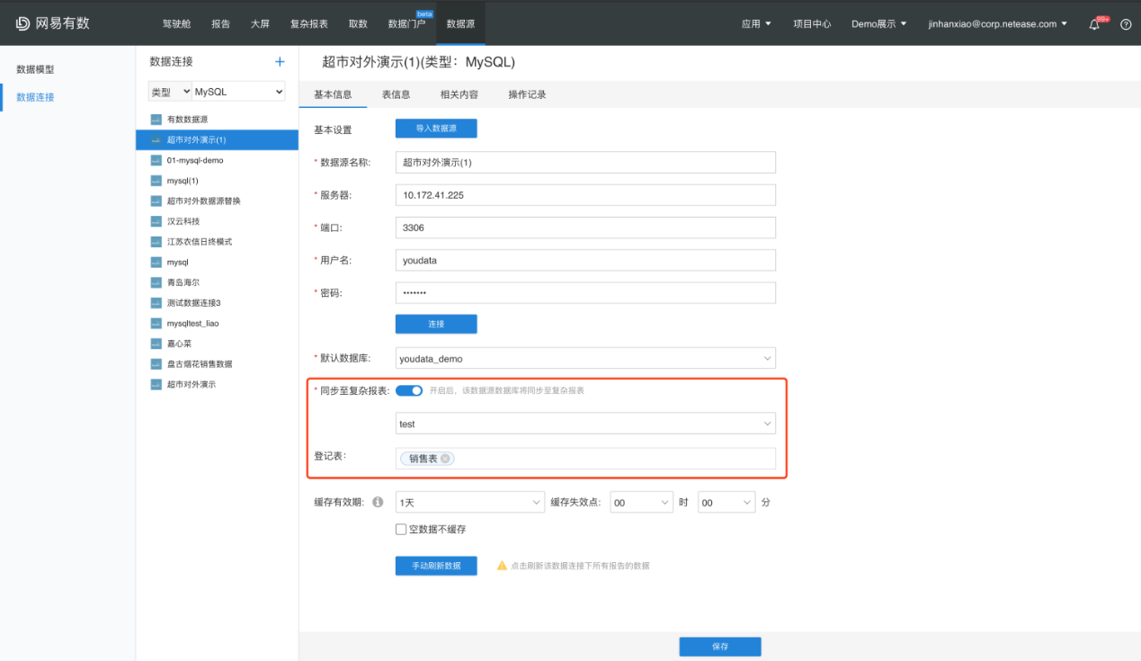在进行模型同步之前需要进行相关数据连接的同步。选择需要同步的数据模型,点击编辑进入编辑页面,打开页面右上角的【同步至复杂报表】开关。