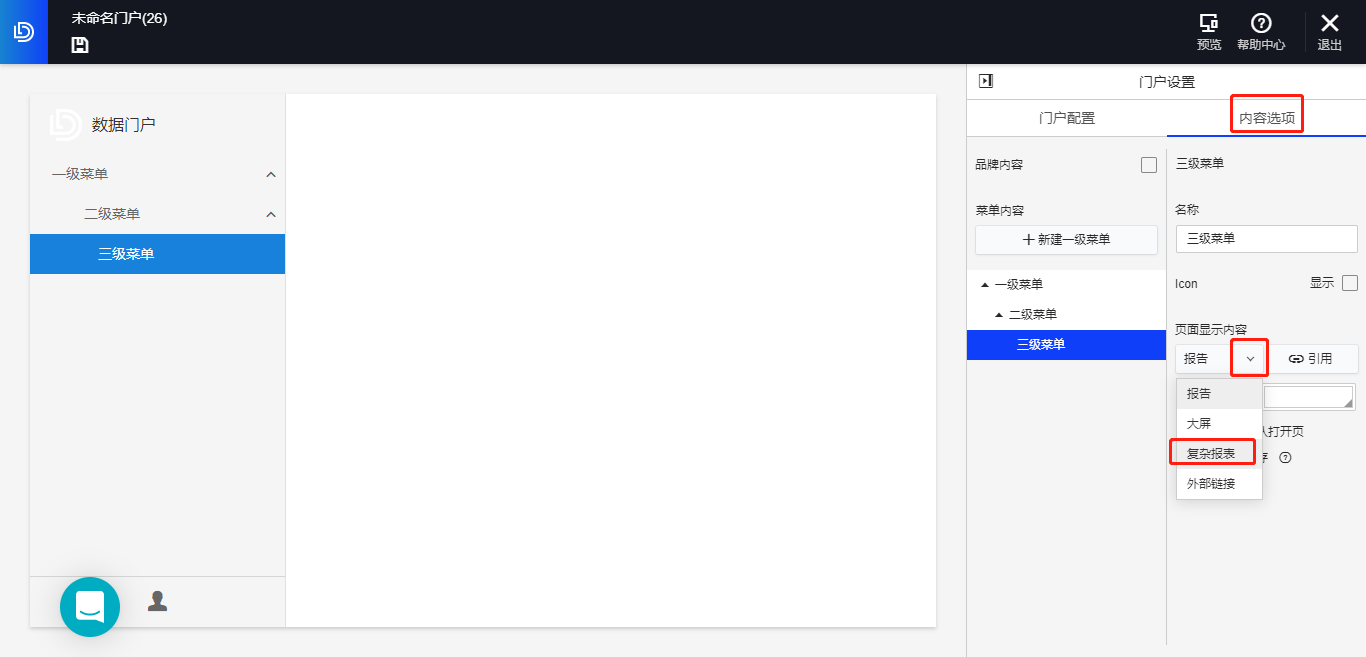 门户引用复杂报告的入口在门户编辑页面的内容选项,点击报告右侧的箭头按钮,即可选择引用复杂报表,具体操作与引用报告一致。