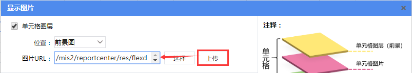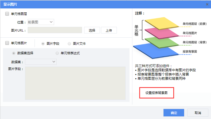 插入单元格图片、背景图可以设置单元格图层、单元格图片以及报表背景图,如下图所示: