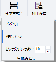 设置报表分页方式,报表按纸分页、不分页和按行分页,默认按纸分页。若需要其他更多设置,可单击“其他设置”进入分页设置页面。