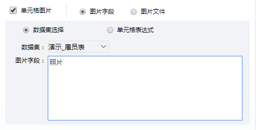 - 图片字段是图片存在数据库的某个字段中,设置为图片字段后可以通过读取该字段从数据库中取出图片显示在单元格中。分为数据集选择和单元格表达式两种。