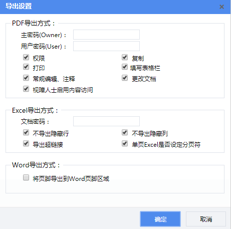 导出PDF、EXCEL、WORD相关的设置,可以设置导出后的文档是否需要密码,文档权限,是否导出页眉页脚等。界面如下图所示: