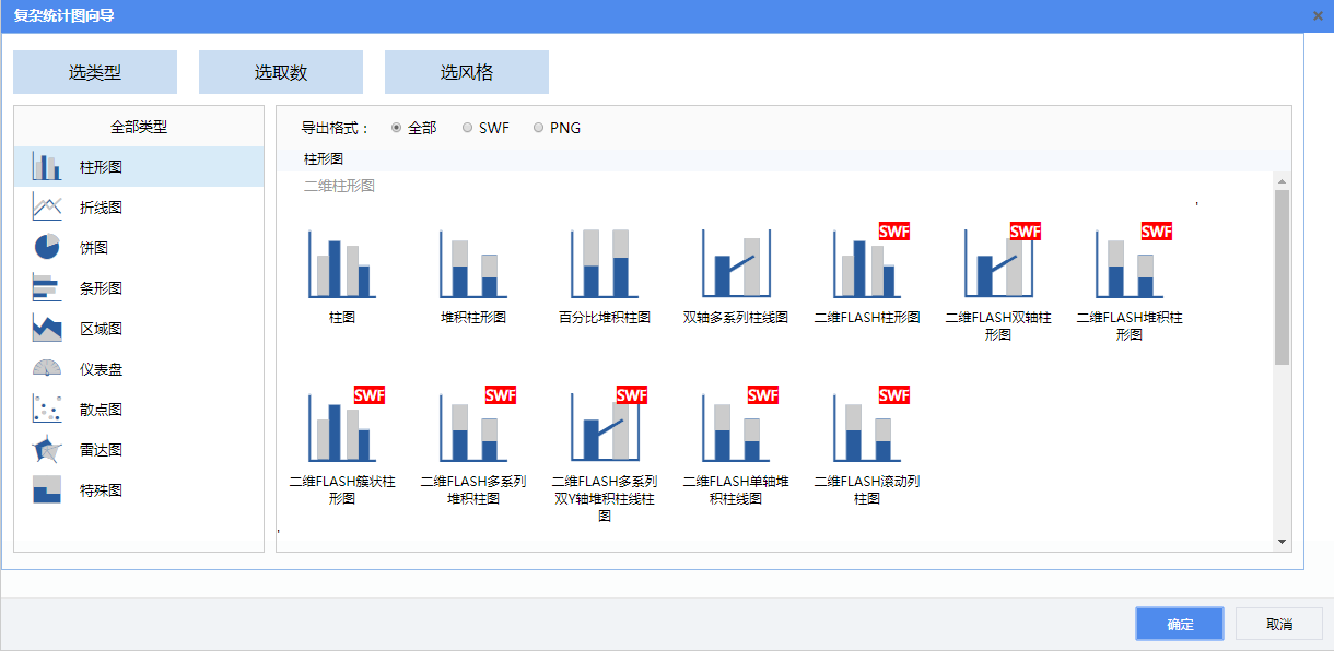 为当前单元格插入一个统计图,点击后进入到统计图定义向导界面。统计图分为传统的静态统计图和echarts统计图。