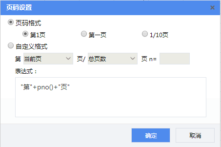 可以在报表内指定位置插入报表页码,系统自带3种预定义页码样式,用户也可以根据自己需要通过自定义来自行定义页面的显示样式,操作界面如下图所示。