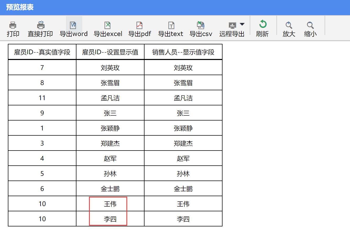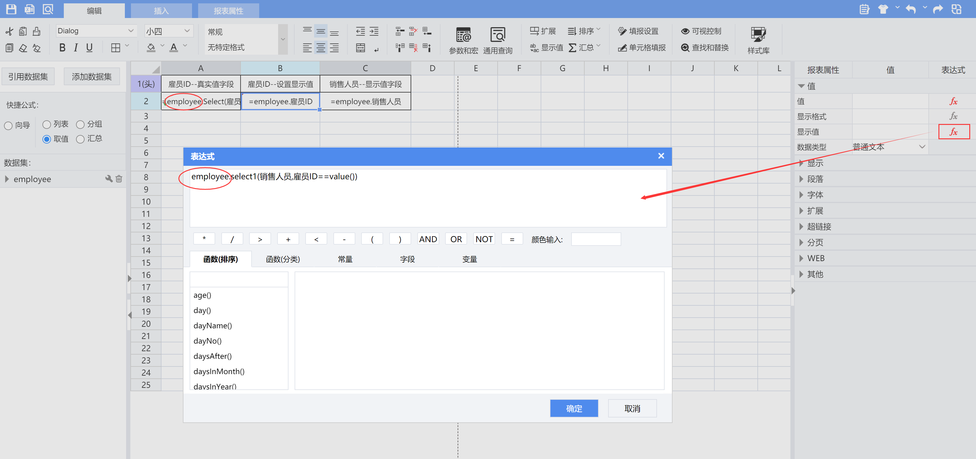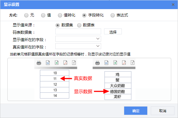 特别地,当码表中真实值不唯一,并且报表主体数据和显示值使用同一个数据集的情况下,建议设置显示值表达式,再右侧属性栏—显示值处使用select1表达式实现。工具栏中显示值—字段转化得原理是生成一个真实值与显示值的键值对,当真实值存在相同的值时,后面的值会覆盖前面的,可能会导致显示值不匹配。