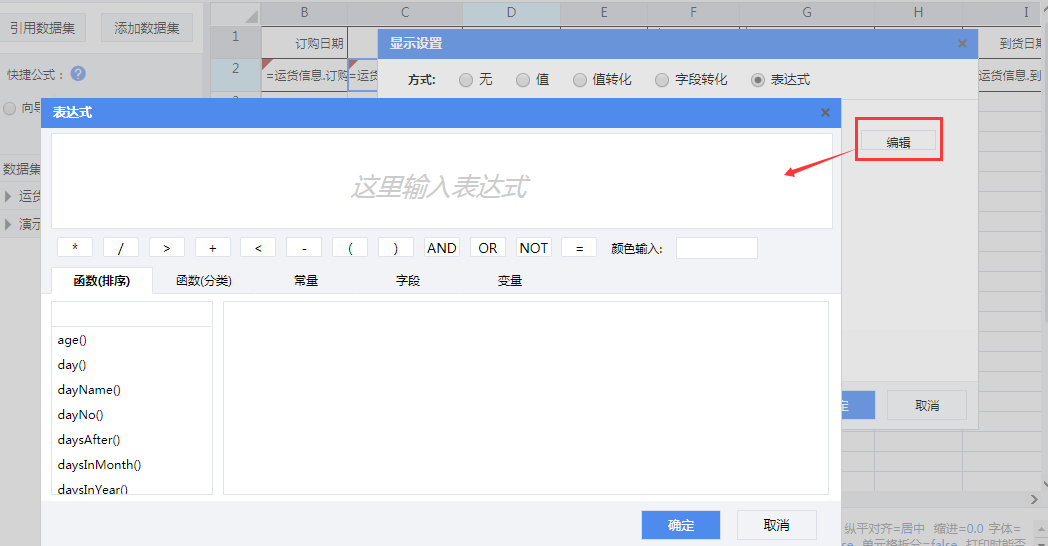 2.选中C2单元格,上方菜单栏选择【编辑】—【显示值】,选择表达式,在输入框内直接输入表达式,或者点击【编辑】按钮,进入表达式设置页面设置表达式。