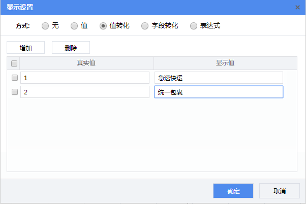 - 值转化:设置真实值和显示值的对应关系,例如运货商ID,”1”显示为”急速快运”;”2”显示为”统一包裹”。设置界面如下图: