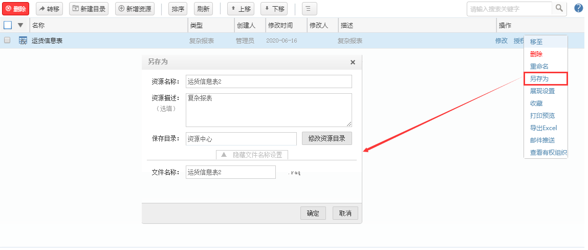 在 资源中心 下找到“运货信息表”,选择资源名称后的【更多】里的【另存为】,将报表另存为“运货信息表2”。找到“运货信息表2”,点击【修改】进入设计器。
