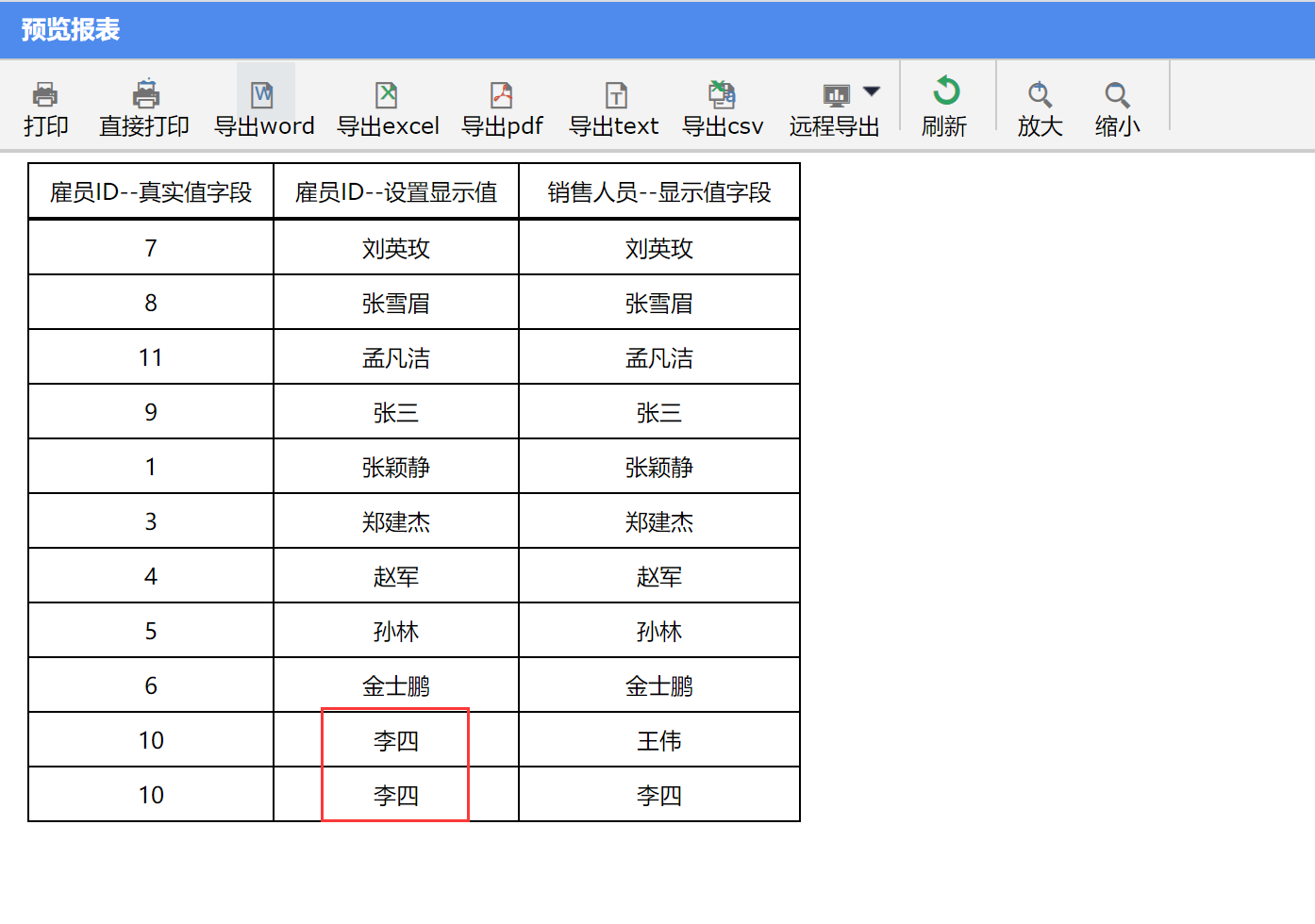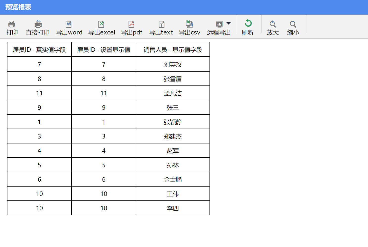 注意:新建报表对应的字段将自动带入对应数据集中字段的预定义显示值,用户仍可在报表中通过显示值向导对显示值进行修改。(在显示值向导中修改显示值定义,不影响数据集、数据表中预定义显示值。优先级:复杂报表单元格的显示值设置> 数据集字段的显示值设置> 数据表字段的显示值设置)