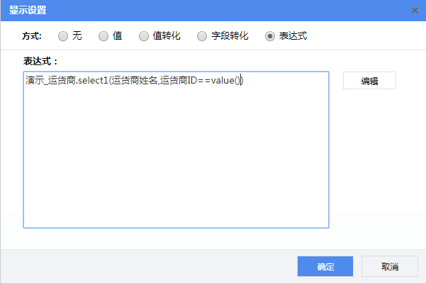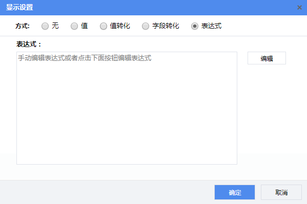 - 表达式:用户可以通过编写表达式来设置本单元格的显示值。设置界面如下图: