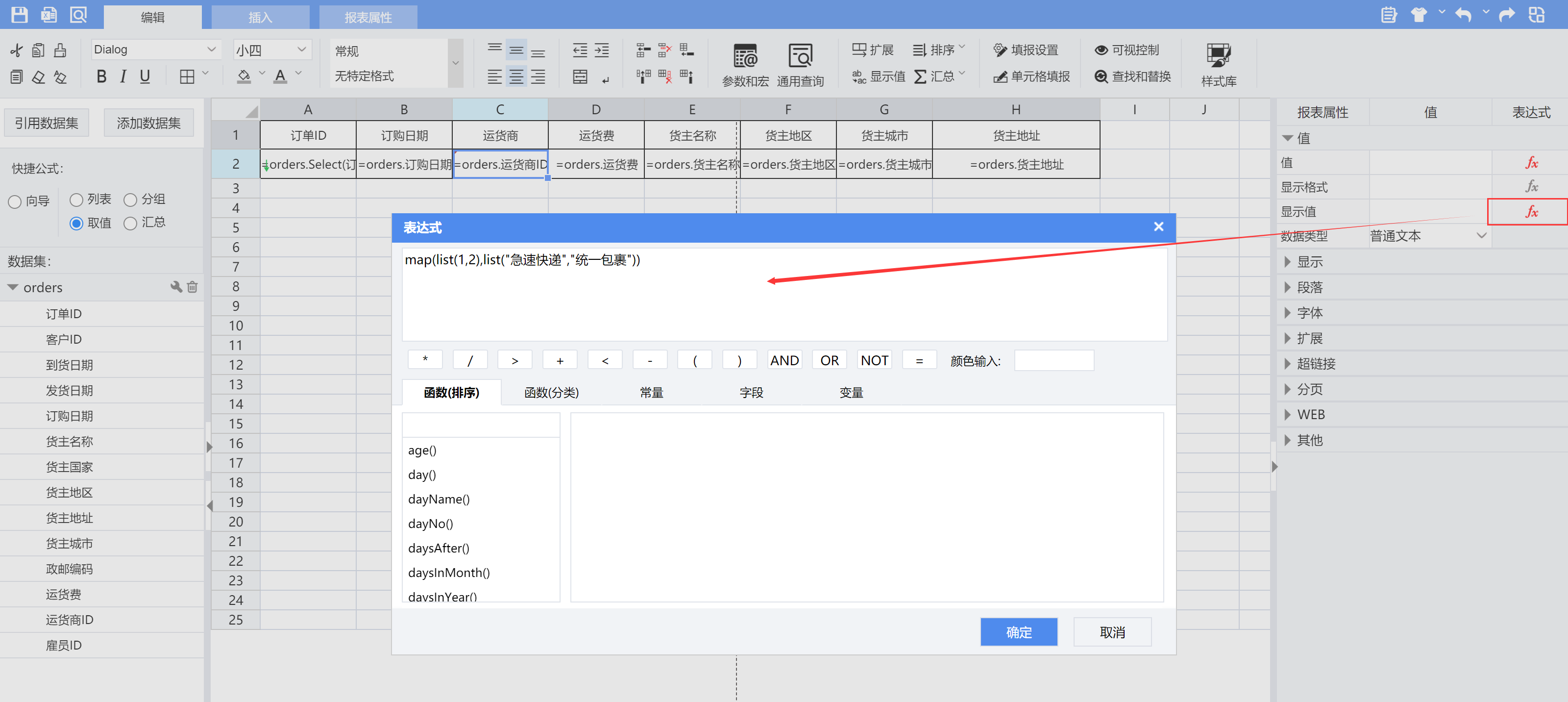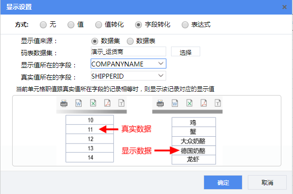 选中C2单元格,上方菜单栏选择【编辑】—【显示值】,选择字段转化,设置好显示来源为数据集,码表数据集为“演示 _ 运货商”,显示值字段为COMPANYNAME,真实值字段为SHIPPERID,点击【确定】。如下图所示: