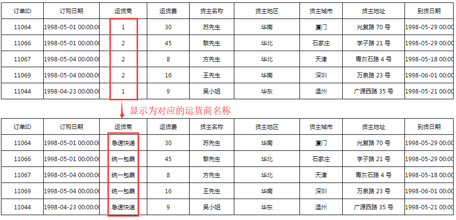 在原始数据表中,保存的是编码性质的数据,而在数据呈现时,需要显示的是有意义的实际值。如数据库的订单表中只有运货商ID,希望将报表中的运货商ID显示为对应的运货商名称,如下图所示: